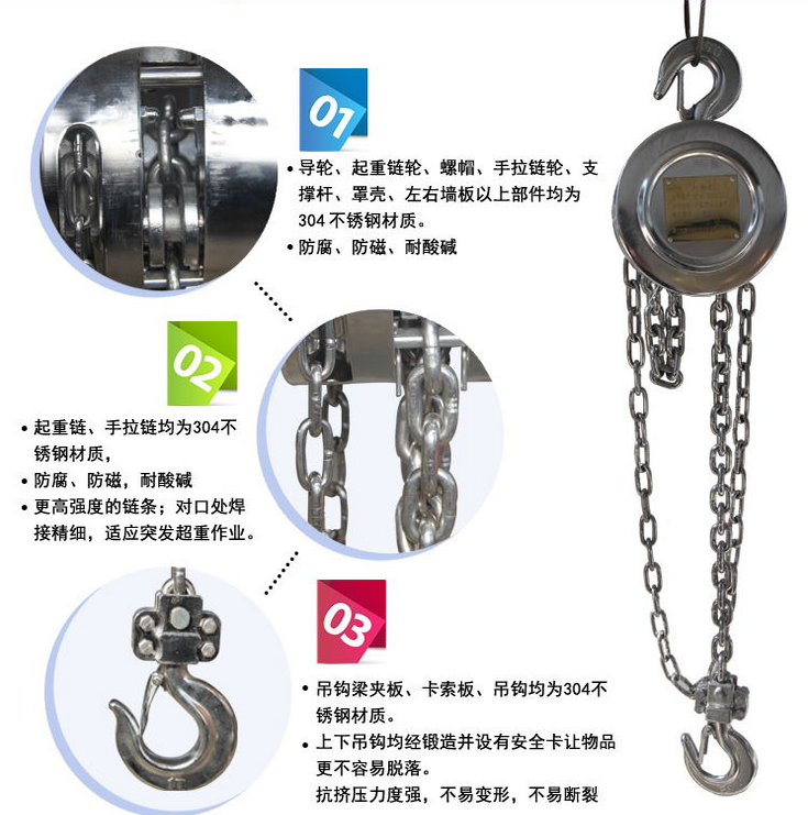 304材質(zhì)不銹鋼手拉葫蘆0.5噸--20噸是一種常見(jiàn)的民用起重設(shè)備,用途廣泛,具有輕巧便于攜帶、耐腐蝕、耐磨損等住所優(yōu)勢(shì)。
